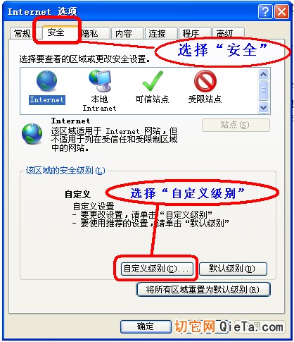 在Internet Explorer 8/9 的菜單欄中,選擇“工具”-“Internet選項”即可打開IE屬性對話框,我們選擇“安全”選項卡中的“自定義級別”如圖所示: