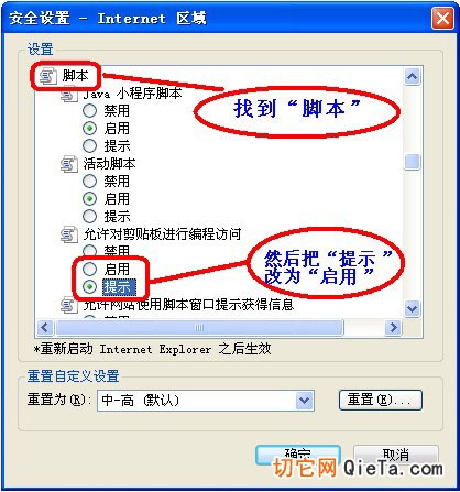 接下來,在“安全設(shè)置-Internet 區(qū)域”設(shè)置對話框中找到“允許對剪切板進(jìn)行編程訪問”并設(shè)置為“啟用”單擊確定即可,如圖所示: